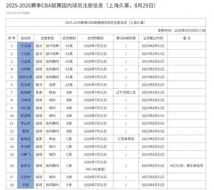 北京时间8月29日,CBA官网公布上海男篮注册18名球员,其中王哲林续约3年D类顶薪合同,张镇麟与崔晓龙两位国字号球员转会加盟,李添荣续约3年C类合同,刘礼嘉续约3年B类合同,闫鹏飞续约1年C类合同。